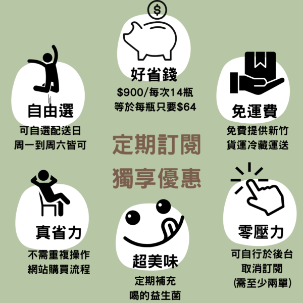 - 下單綁定後,需至少出貨達兩次,方能取消訂閱,恕不接受提前解約。如不能接受,請至單買豆奶克菲爾下單,則無此限制。